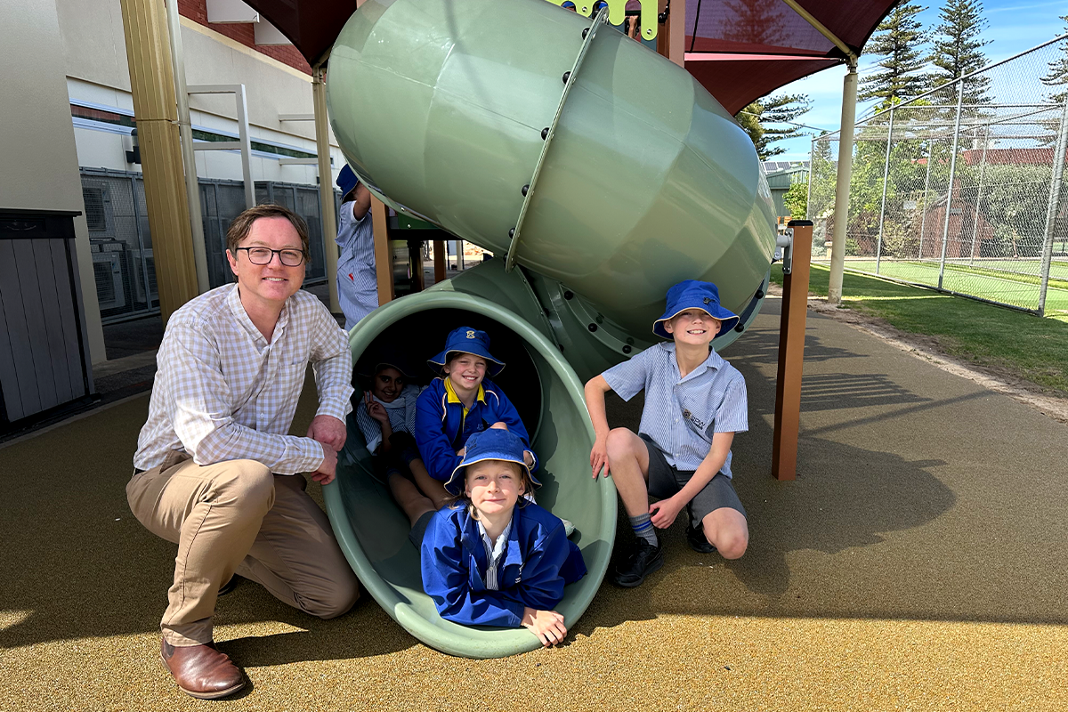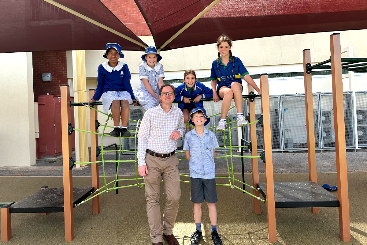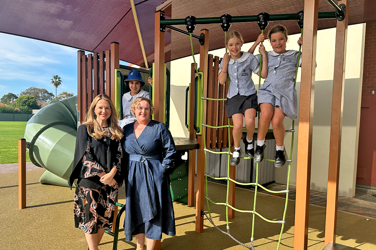 Pictured: Year 4 students enjoying the first play on the new Taylor Playground joined by David Brock, Business Director and SPW Foundation Treasurer, Helen Finlay, Principal & SPW Foundation Chair and Kate Hobart, Old Scholar Parent & SPW Foundation Member.